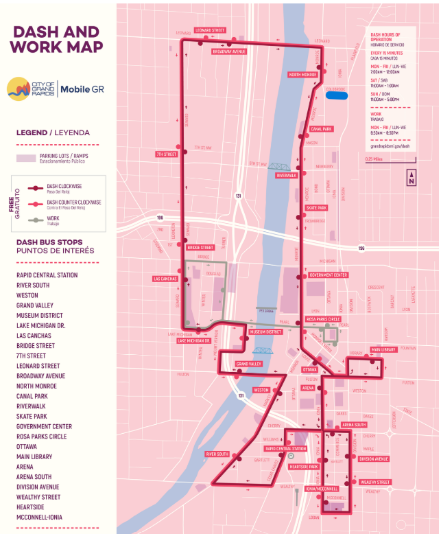 Click here to view the full Free DASH bus route, which run every 15 minutes.